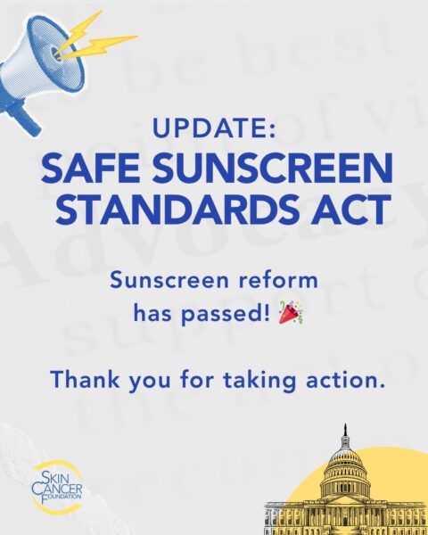 Thank you for teaming up with the Skin Cancer Foundation in advocating for the passage of the SAFE Sunscreen Standards Act, giving Americans access to new sunscreen ingredients to prevent skin cancer and save lives.